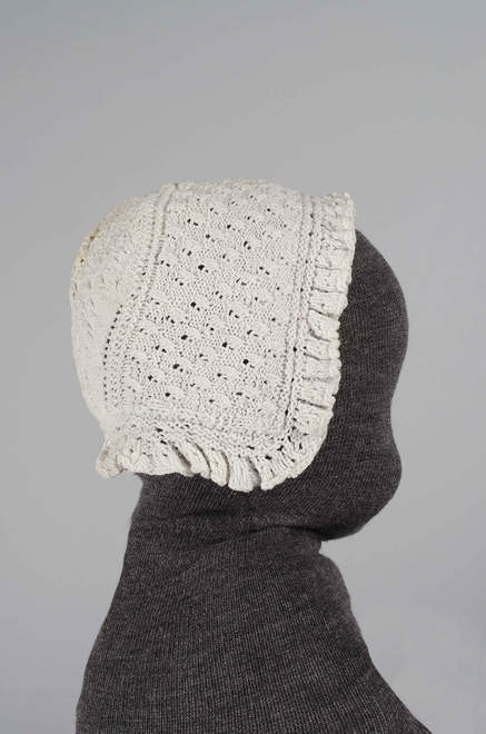 Babymutsje, gebreid van wit katoen met ruches, onderdeel van groep van vier