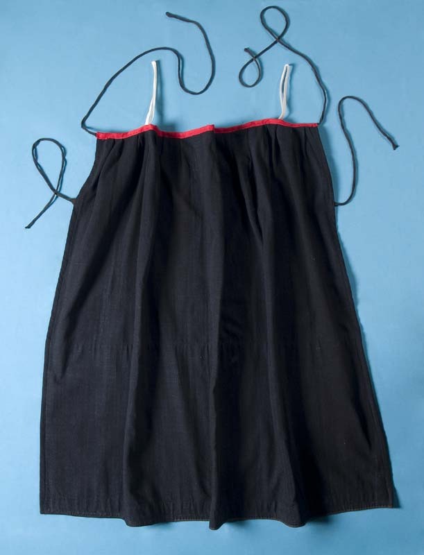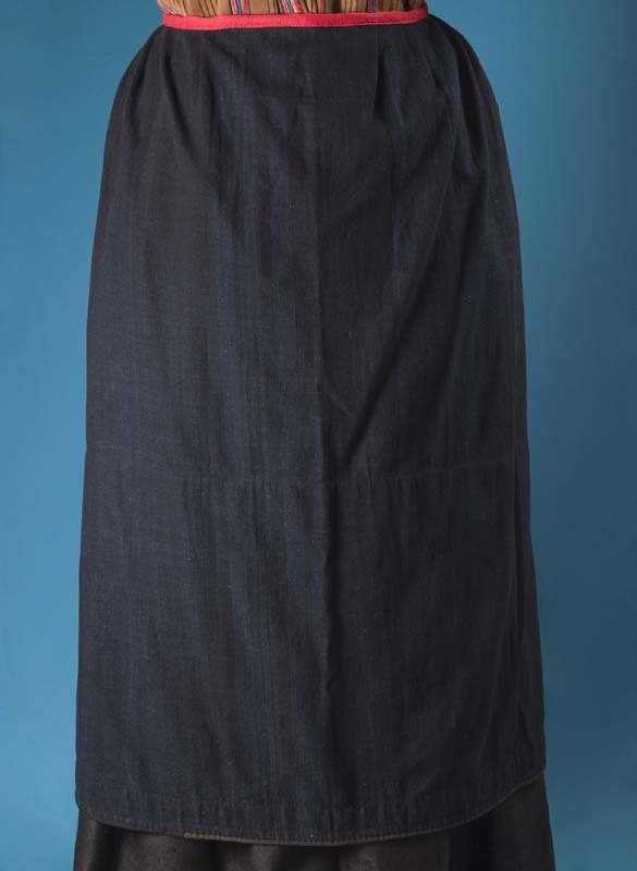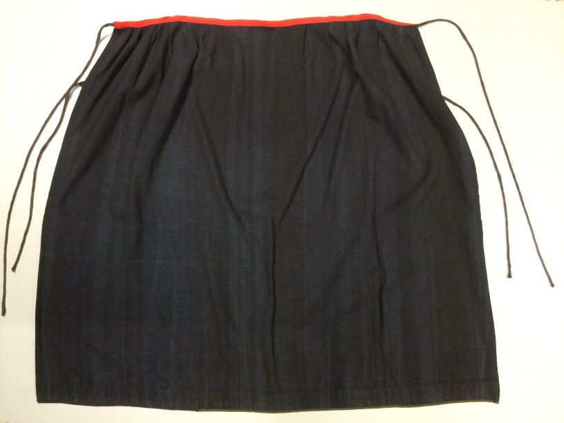 Schort van blauw-zwarte wollen stof aan rood taillebandje gezet, samen binnengekomen met A