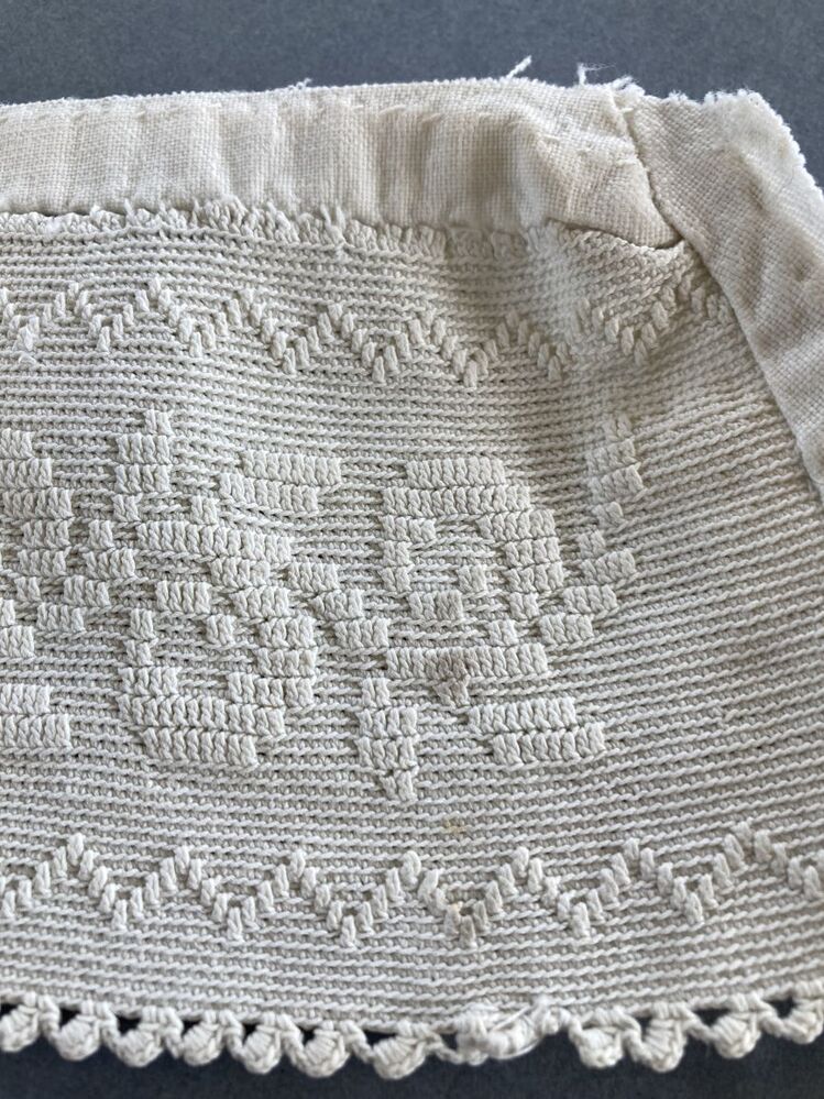 Tipmutsstrook, gehaakt van dunne katoen in reliëfstokjes, met slingerrand