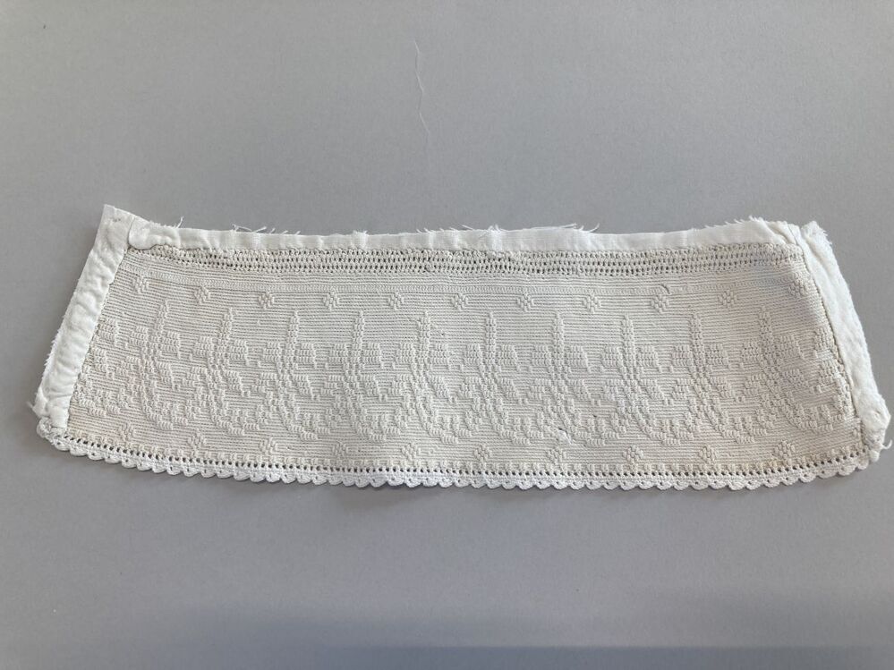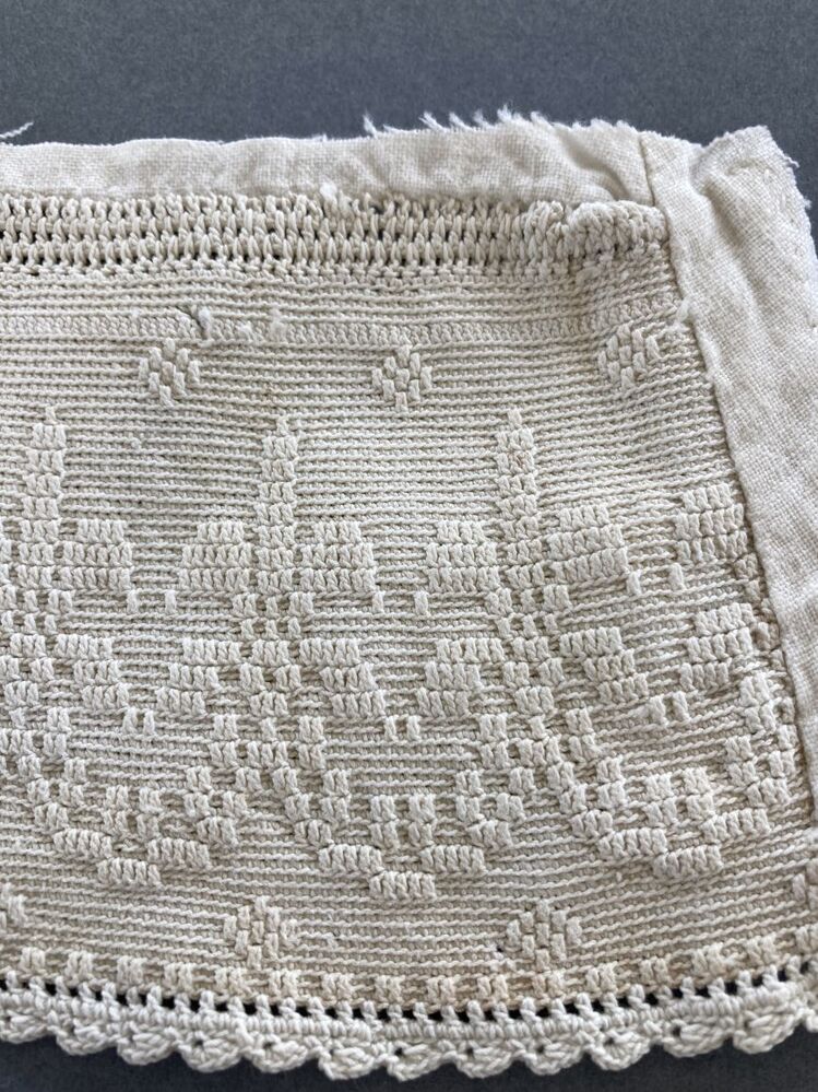 Tipmutsstrook, gehaakt van dunne katoen in reliëfstokjes, met schulprand