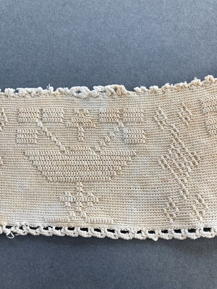 Tipmutsstrook, gehaakt van dunne katoen in reliëfstokjes, met bloempotmotief,