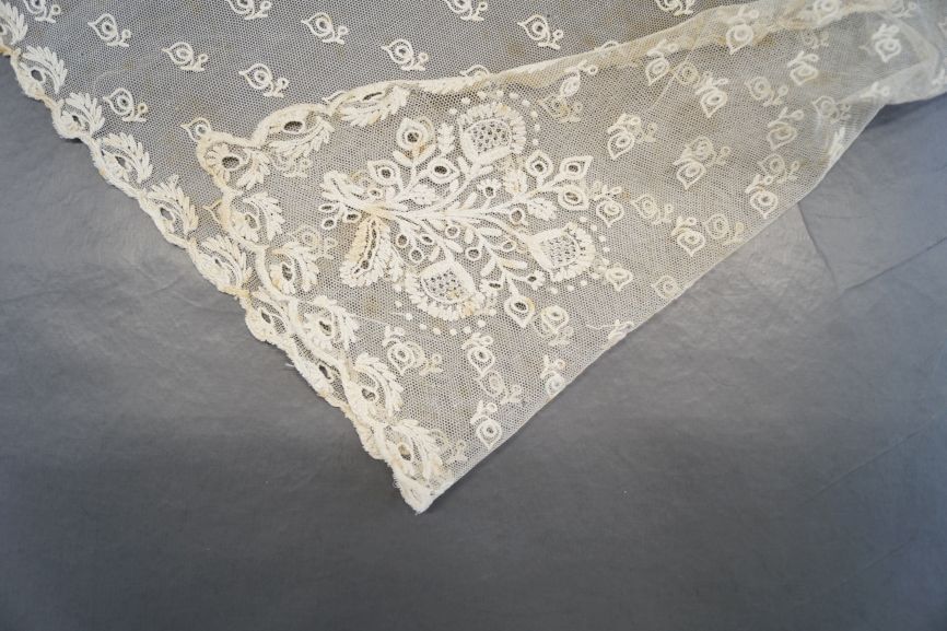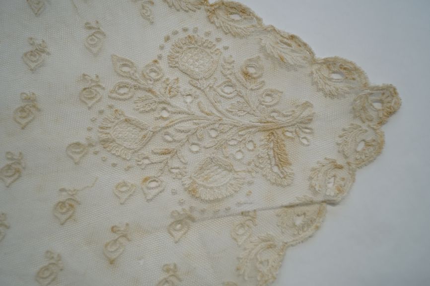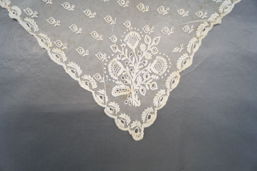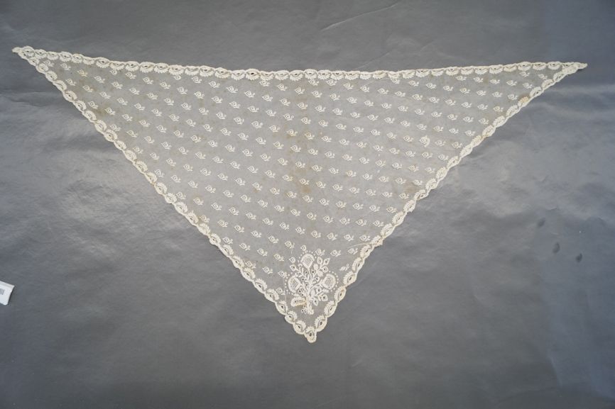 crèmekleurige fichu van tulemet stooimotief in diagonale lijnen, a-symmetrisch bloemknopje