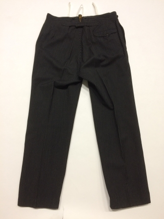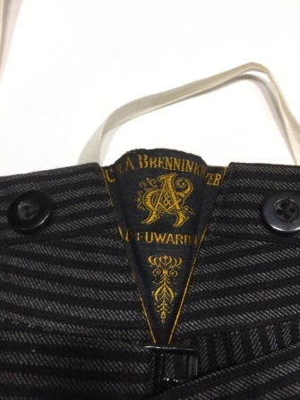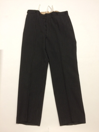 Zwart-grijs gestreepte lange broek van wol met gulpsluiting, onderdeel van bodekostuum van begrafenisvereniging Blessum