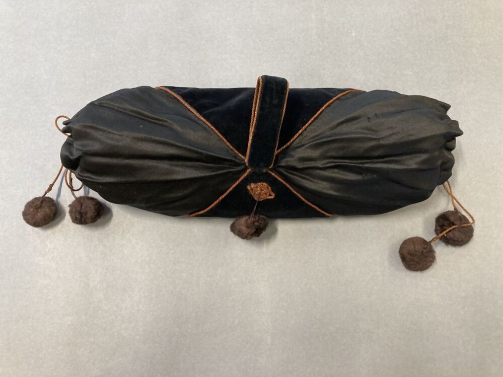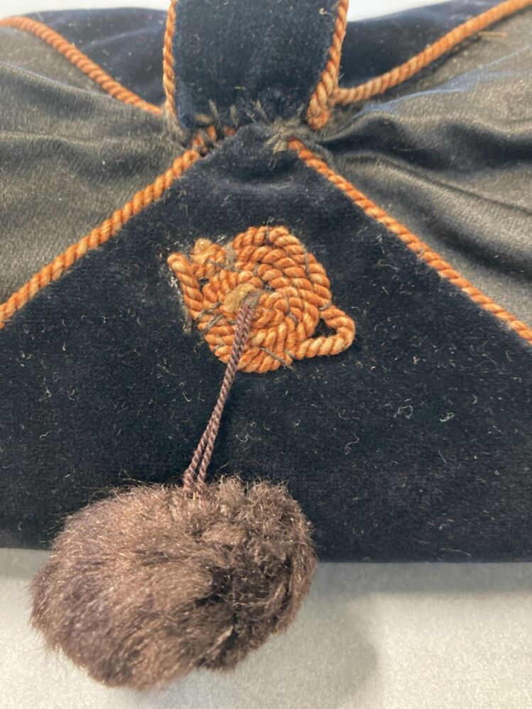 Breitasje van zwart fluweel en zwarte zijde, rondom fluweel afgewerkt met bruin koord