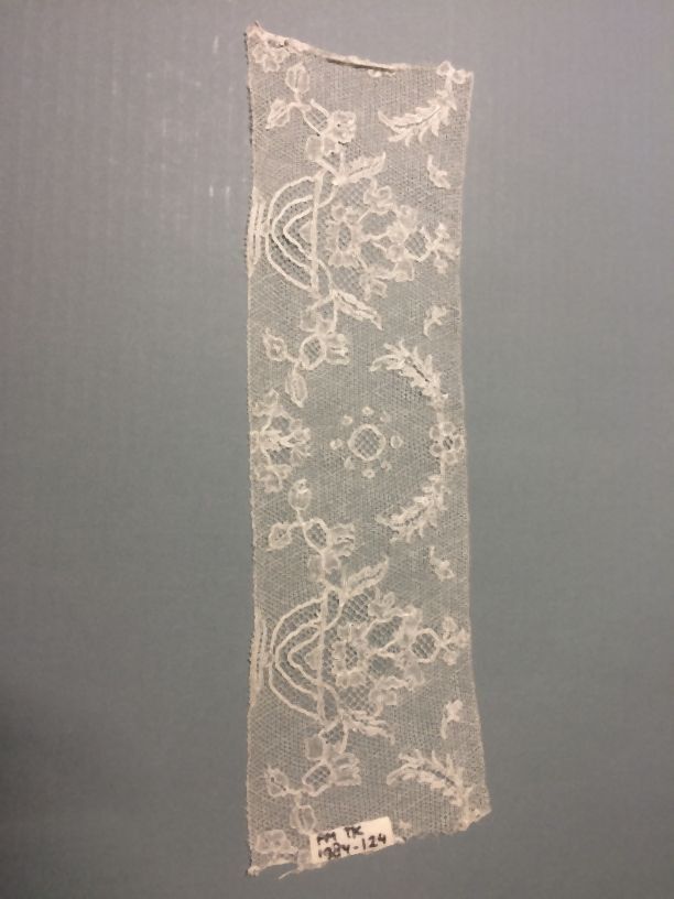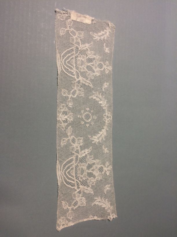 Strook kloskant, pottekant, symmetrisch bloempotmotief in linnenslag met contourdraad op point de Paris grond