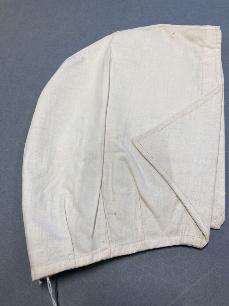 Kookmuts van wit katoen, twee halfronde delen met teruggeslagen punten bij de oren