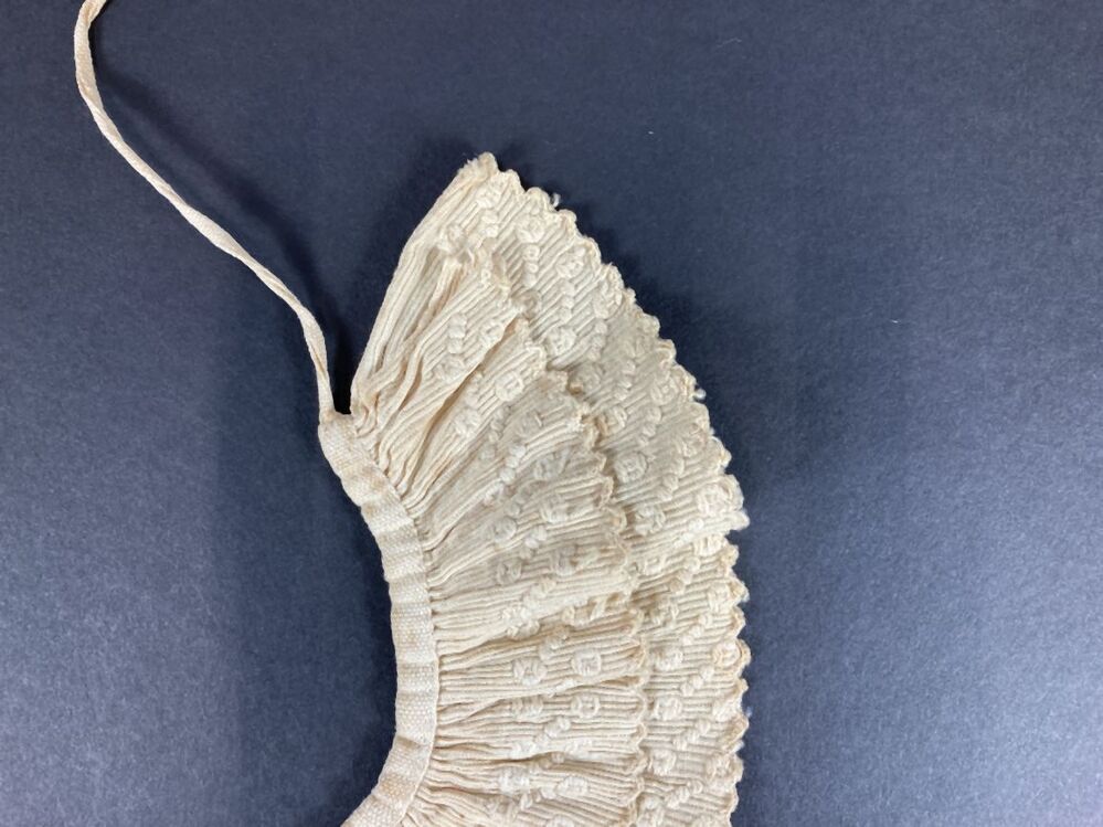 Ecru katoenen kraagje, gerimpeld aan de halsinzet, machinaal borduurwerk