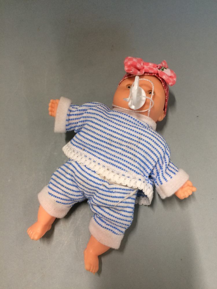 Pop, baby, ongemerkt, kop, armen en benen van kunststof, lijf van lappen, onderdeel van pop met babypakje