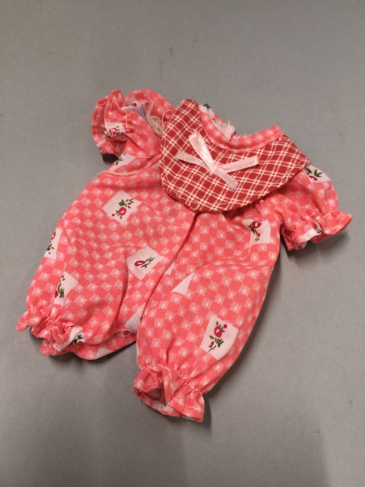 Babypakje, behorende bij pop, ongemerkt, kop, armen en benen van kunststof, lijf van lappen, onderdeel van pop met babypakje