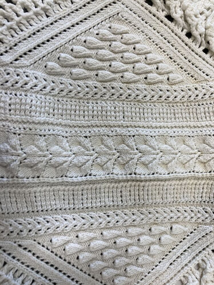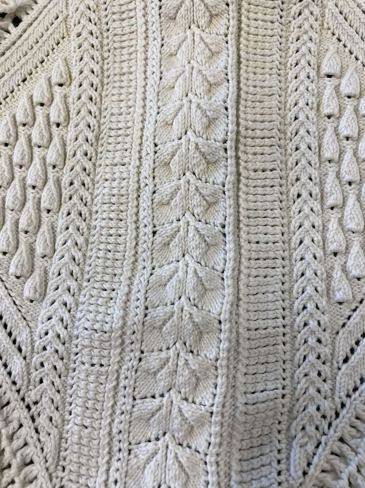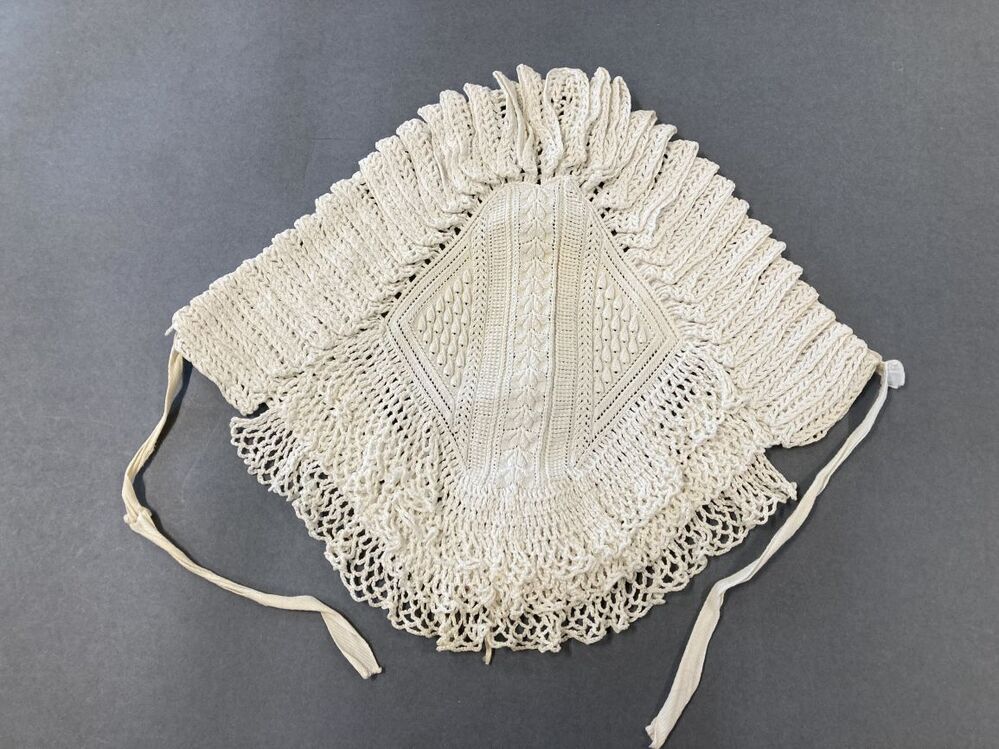 Muts met ruitvormig bolletje van ajourbreiwerk, met gehaakte hanekam