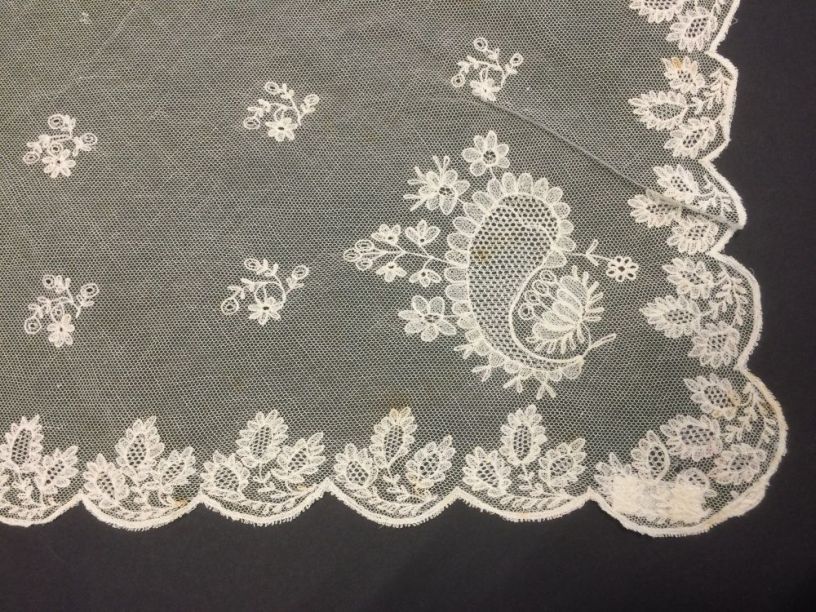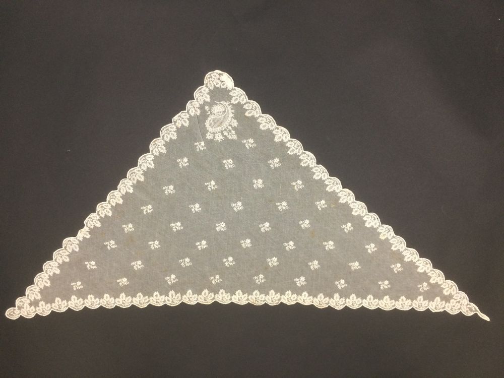 Driekante tipdoek van machinale tule met tamboureer- en open borduurwerk
