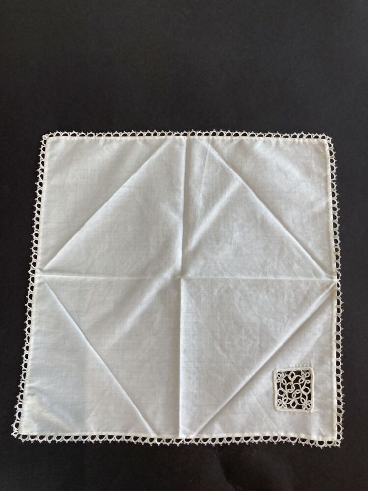 Zakdoek van wit katoenen poplin afgezet met kant van frivolité
