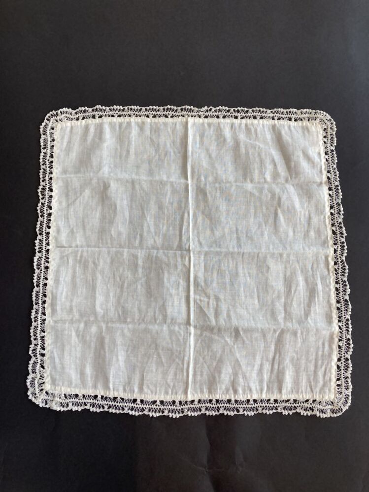 Zakdoek van fijn linnen afgezet met kantje van guimpehaakwerk