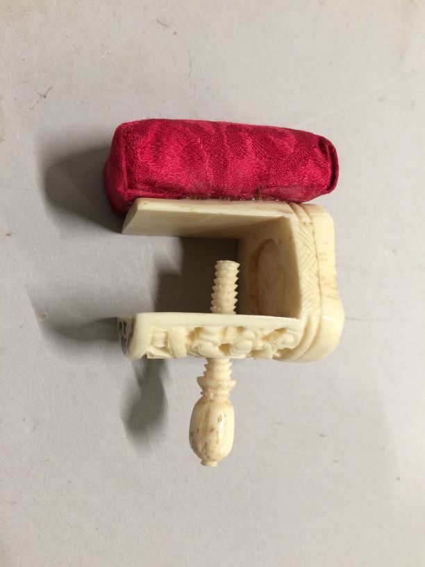Speldenkussen met tafelklem, onderdeel van inhoud naaidoos van Chinees zwart met goud lakwerk, groep van drieëndertig objecten