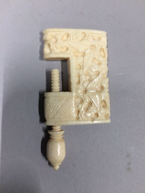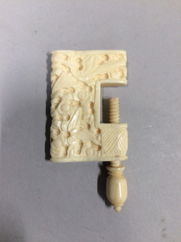 Tafelklem, onderdeel van inhoud naaidoos van Chinees zwart met goud lakwerk, groep van drieëndertig objecten