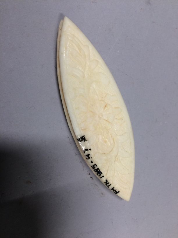 Frivolitéspoeltje, onderdeel van inhoud naaidoos van Chinees zwart met goud lakwerk, groep van drieëndertig objecten