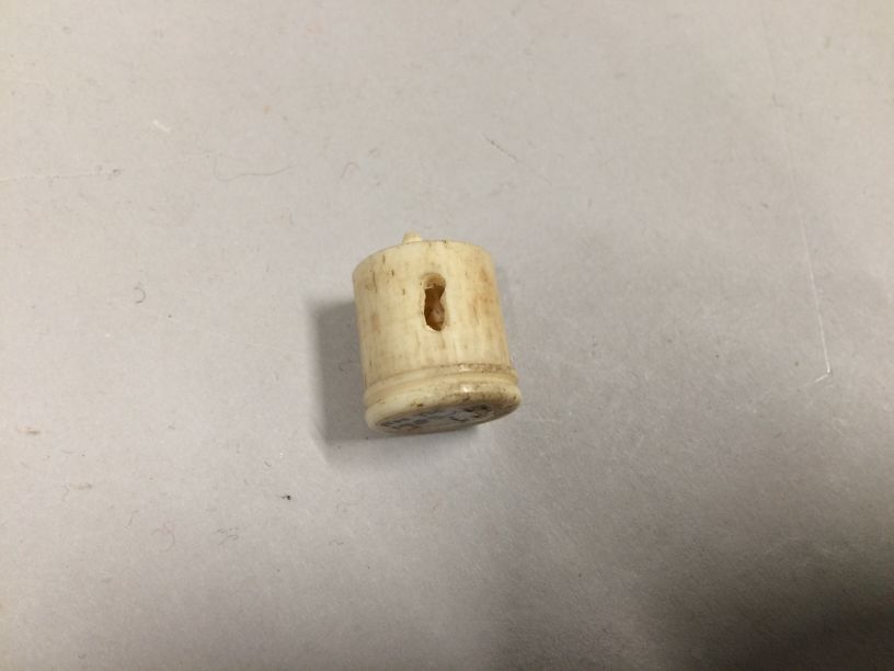 Tonnetje, onderdeel van inhoud naaidoos van Chinees zwart met goud lakwerk, groep van drieëndertig objecten