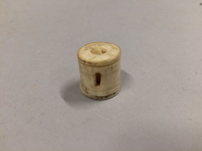 Tonnetje, onderdeel van inhoud naaidoos van Chinees zwart met goud lakwerk, groep van drieëndertig objecten