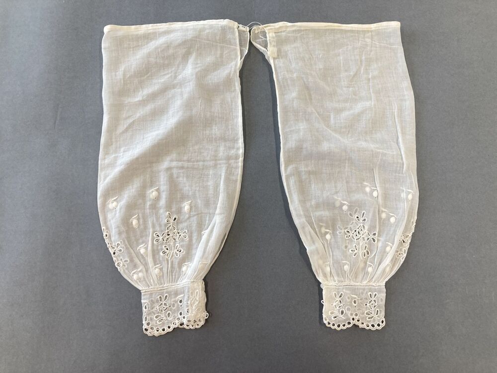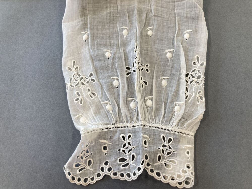 Ondermouwen van wit transparant batist met broderie, gerimpeld aan manchet gezet