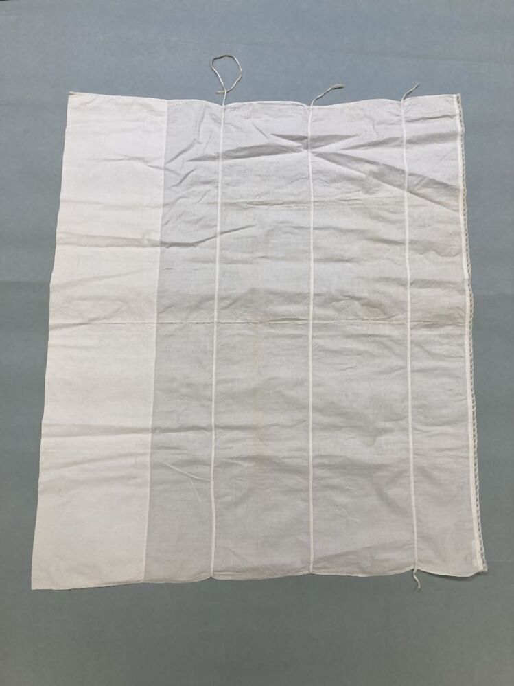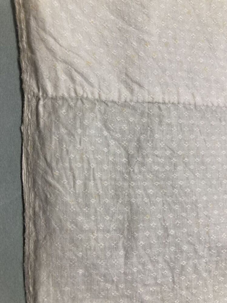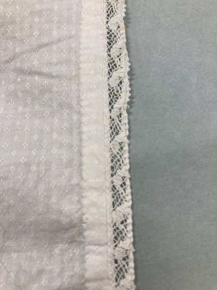 Pakdoek van wit katoen met ingeweven mini ruit motiefjes, afgezet met smal valenciennekantje