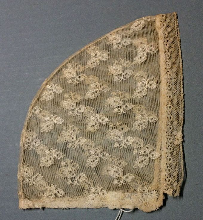 Bol van floddermuts van fijn doorgestopte tule, onderdeel van groep van zeven mutsen