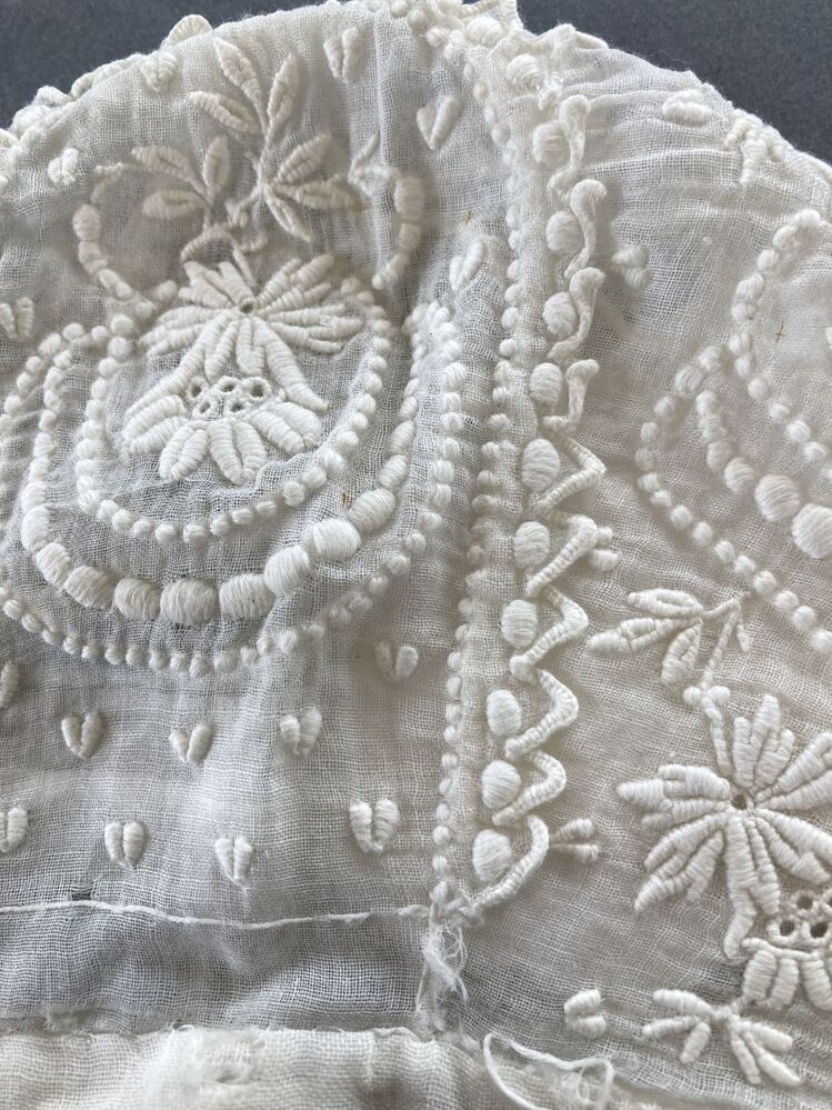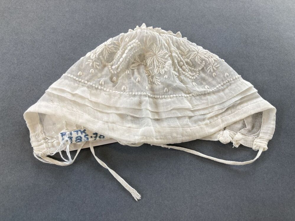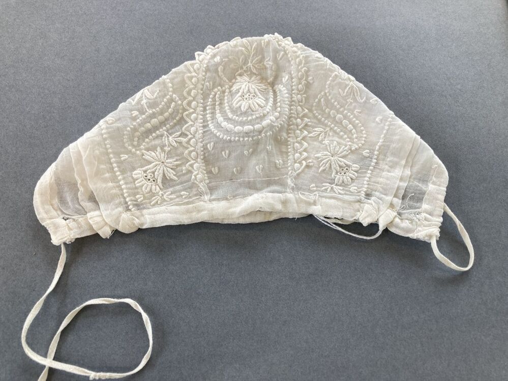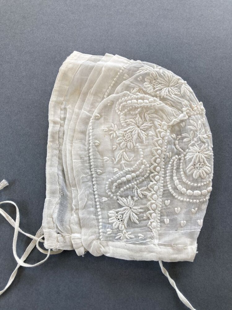 op de groei gemaakt babymutsje van neteldoek met frans borduurwerk