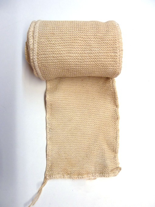 Band van ribbelbreiwerk, ongebleekt katoen, afgewerkt met gehaakte rand, te gebruiken als rekverband