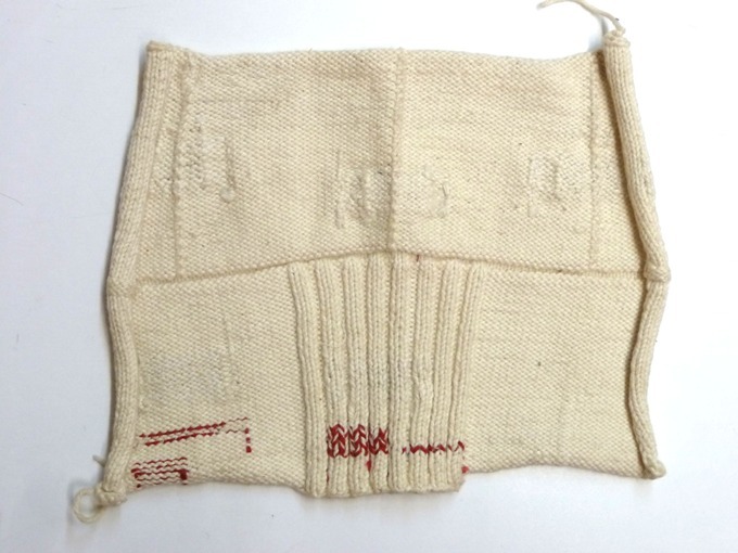 Maaslap met rechte en boordsteken in tien mazen, proefstuk van breiwerk met diverse banden, vermoedelijk gebruikt als verband, onderdeel van groep van veertien