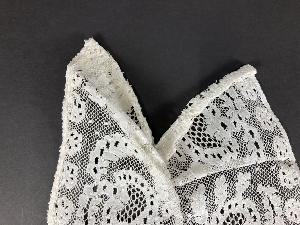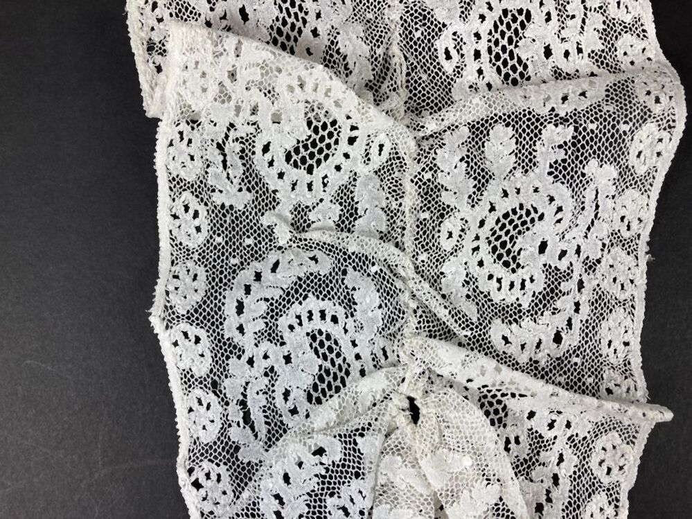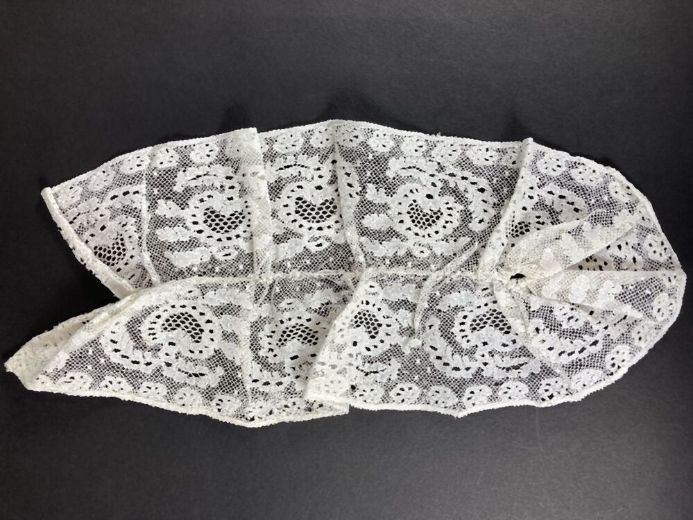 Kanten jabot gemaakt van floddermutsstrook met asymmetrisch ovaal bloemmotief op Rijsselse grond, onderdeel van groep van vijf
