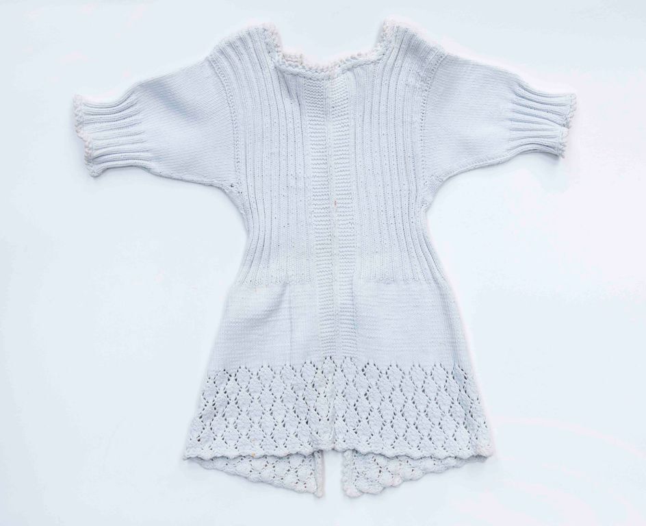 Borstrok van witte katoen met ajour gebreide zoom, opening met zeven knopen en knoopsgaten