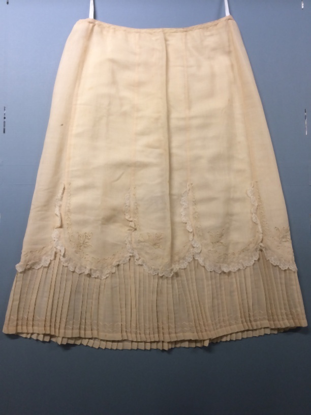 Onderrok van crème kleurige wol, gevoerd met katoen, acht gerende banen, met afgeronde zoom waaraan strook machinaal kant, 18-24 centimeter brede plissé strook, machinaal borduursel