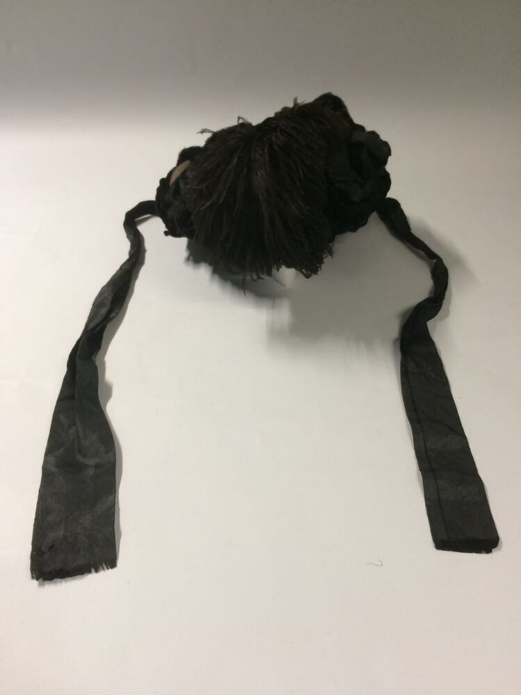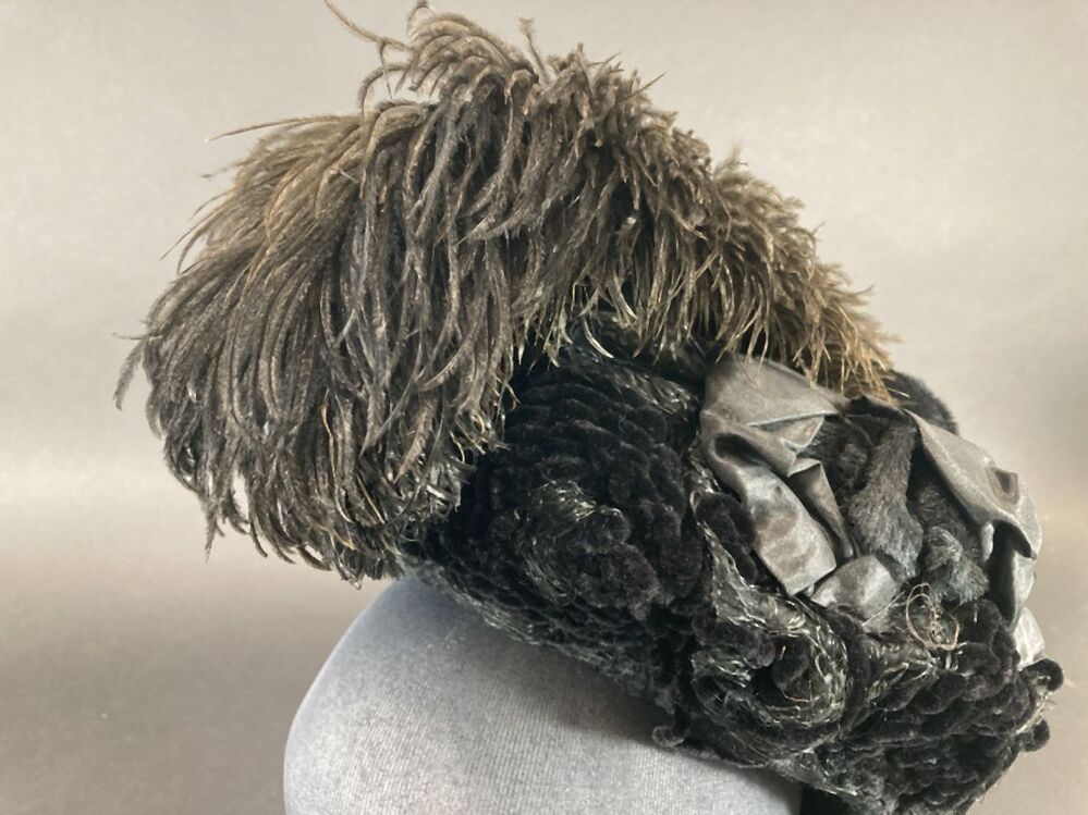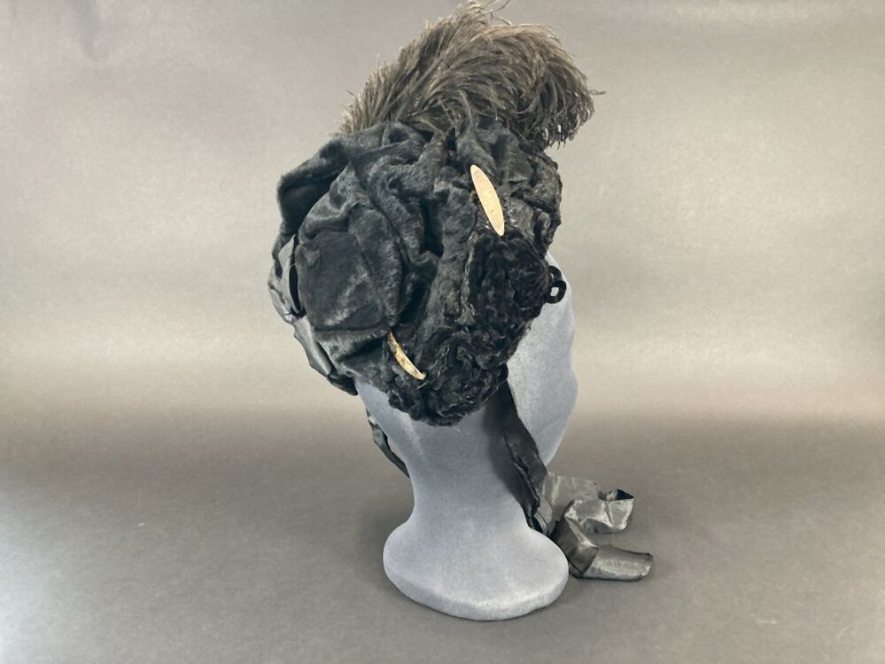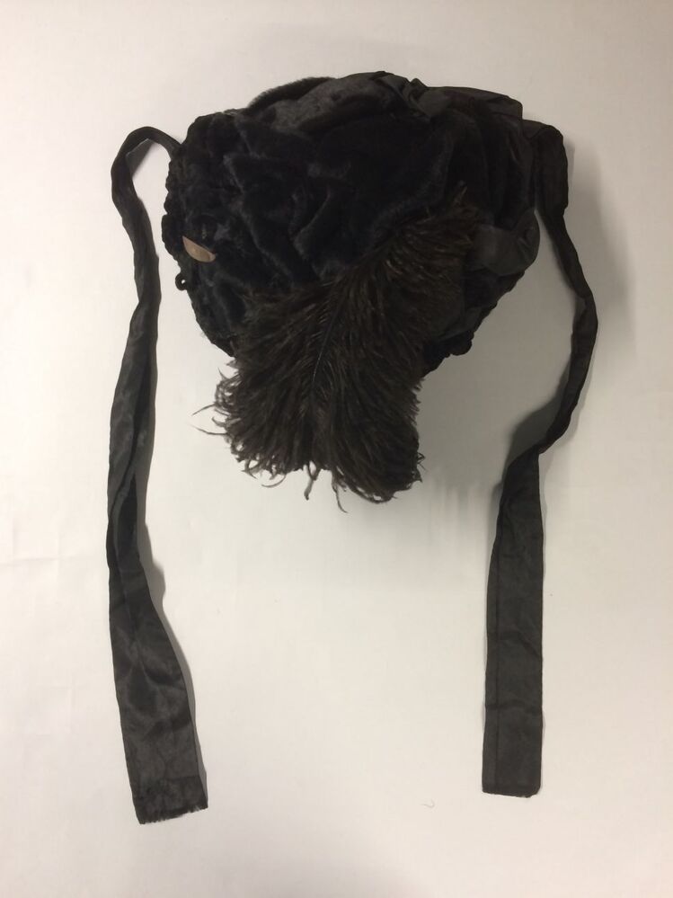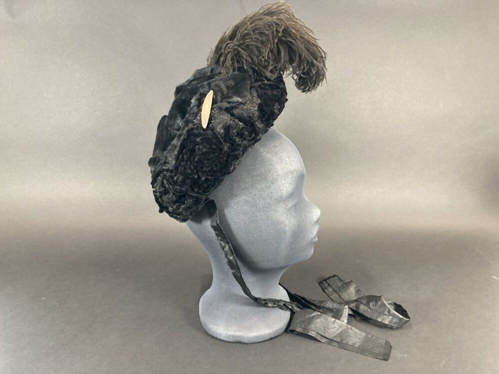 Kypske van zwart rayon fluweel met chenille garen zijde lint en zwarte struisvogelsveer