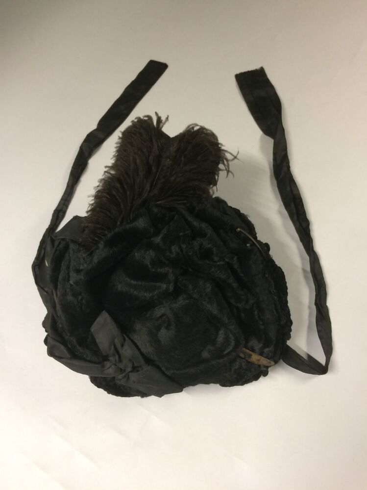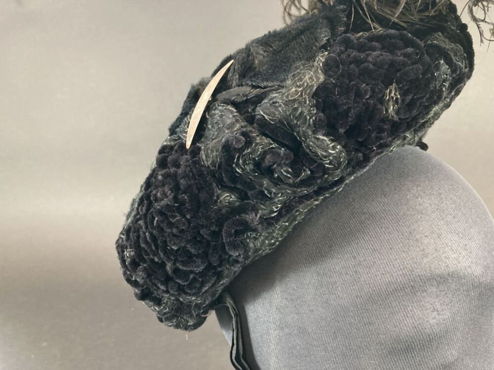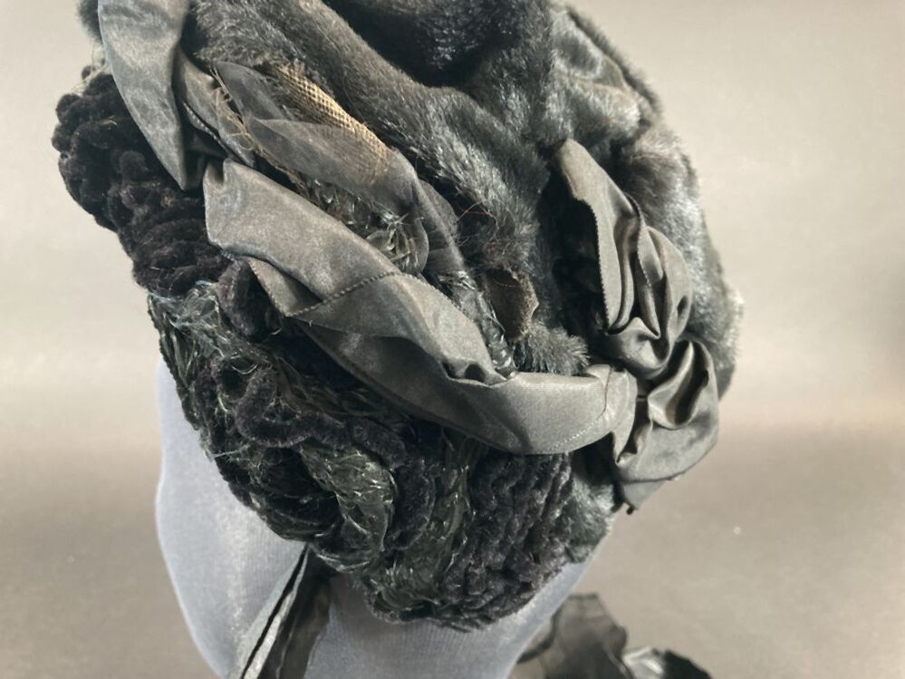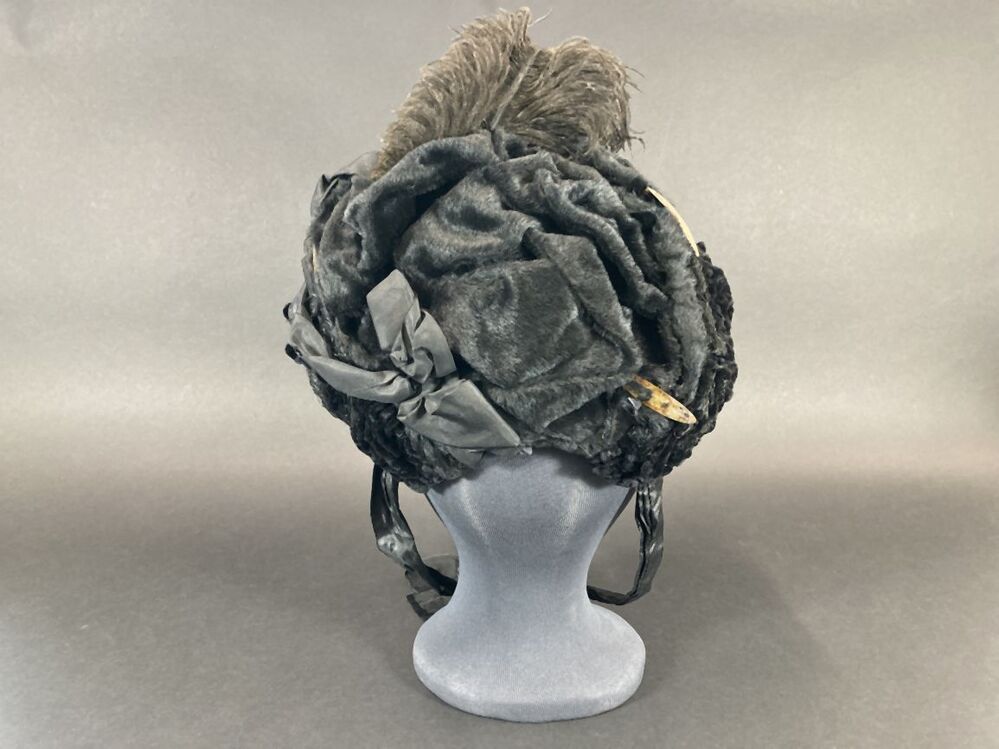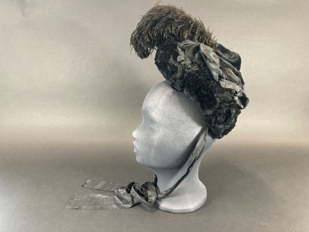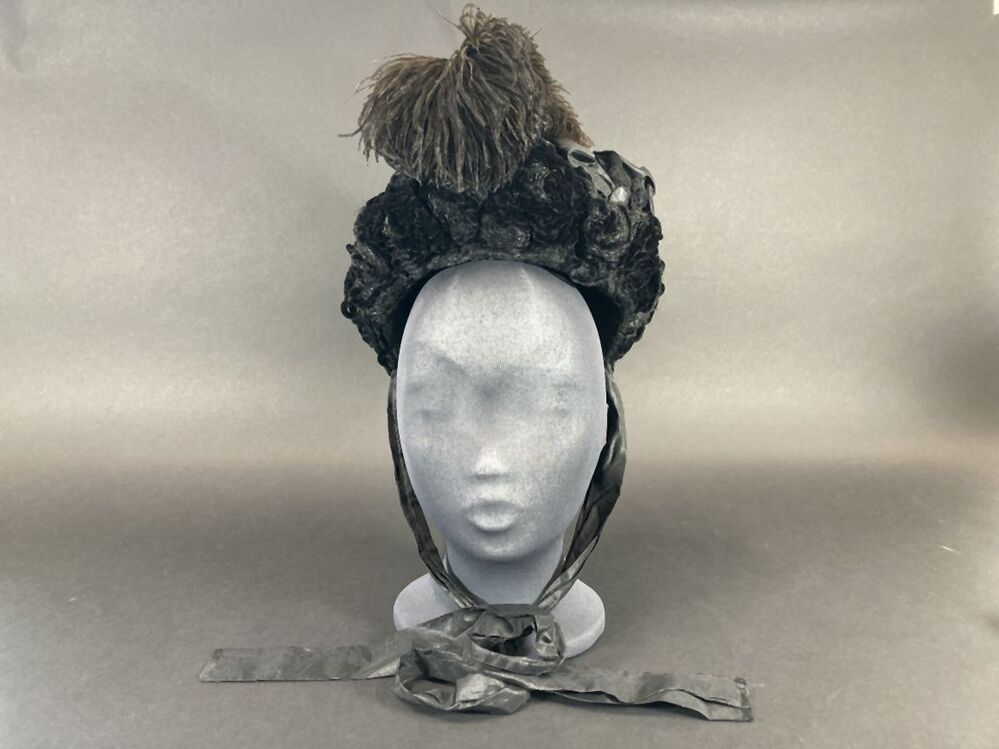 Kypske van zwart rayon fluweel met chenille garen zijde lint en zwarte struisvogelsveer