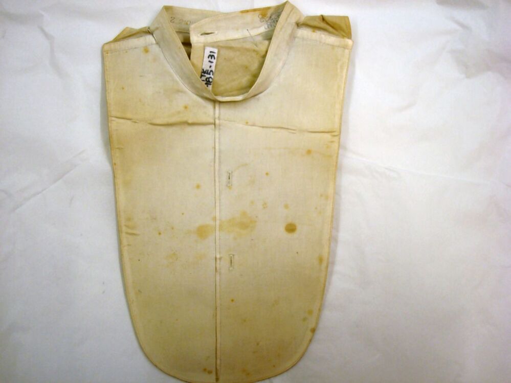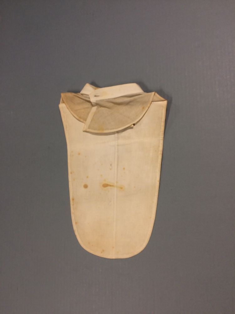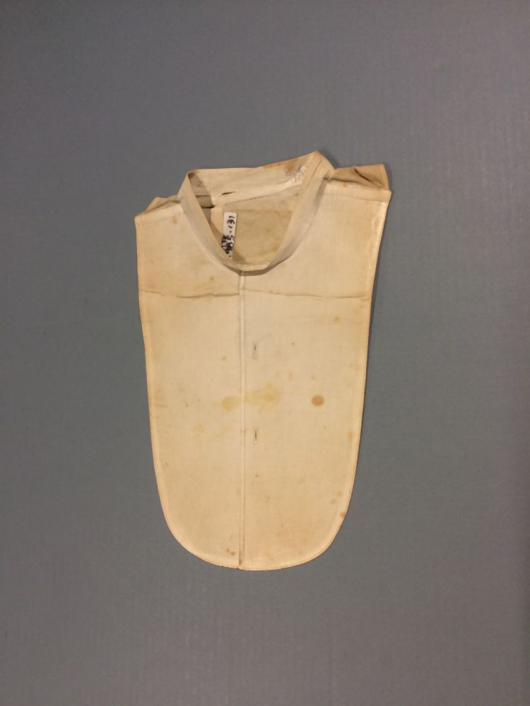 Frontje van wit linnen met suggestie van knoopsluiting, met boordje tot in de nek met knoopsluiting
