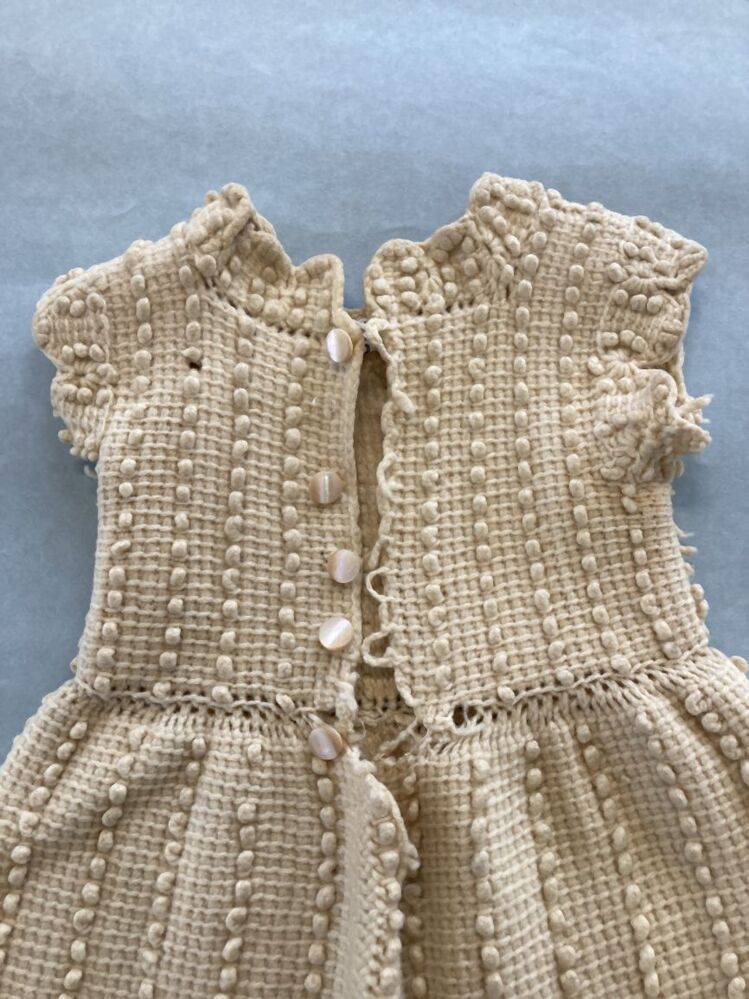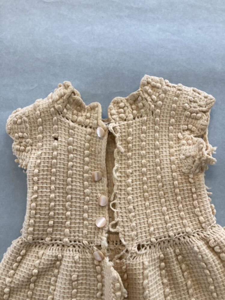 Mouwloos kinderjurkje in Tunisch haakwerk van crème losgetwijnde wol