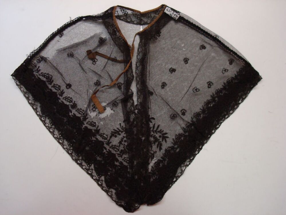 Fichukraag van zwarte tule met tamboereerwerk, machinaal kloskant