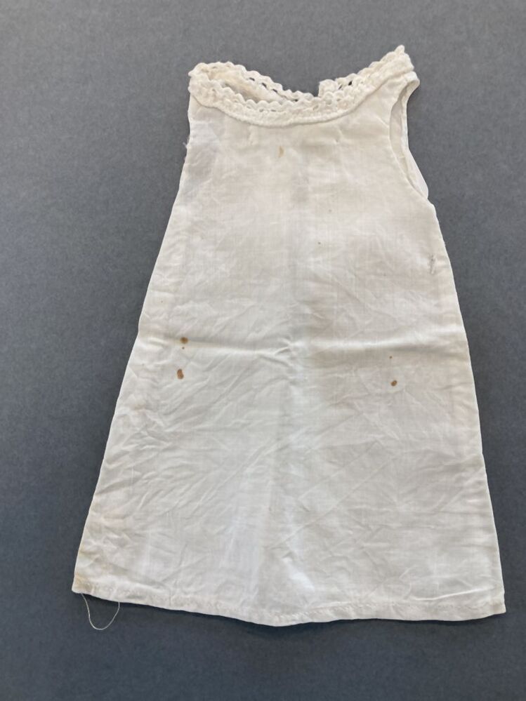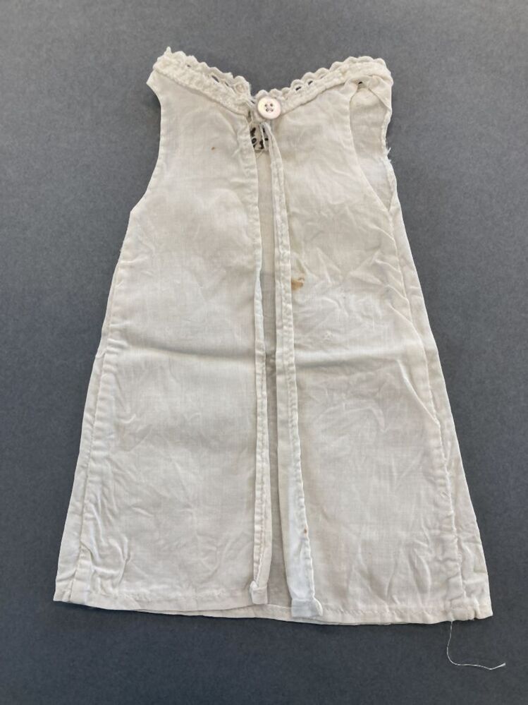 Boezelaar voor pop van wit katoen afgezet met machinaal broderie,