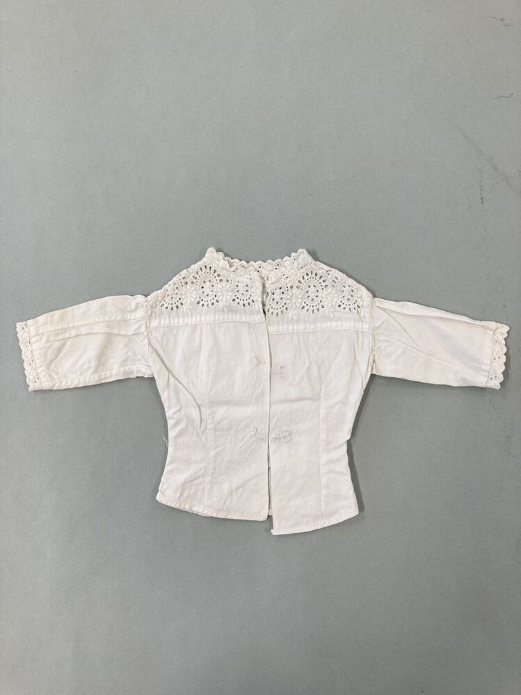 Getailleerde poppenblouse van wit katoen met pas van broderie