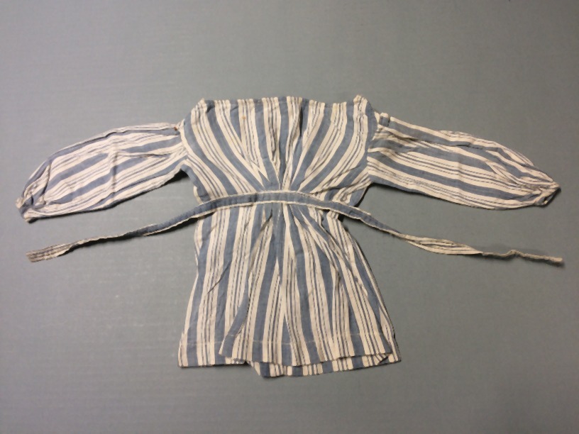 Lang poppenjak van blauw-wit gestreept katoen, met wijde hals en lange mouwen