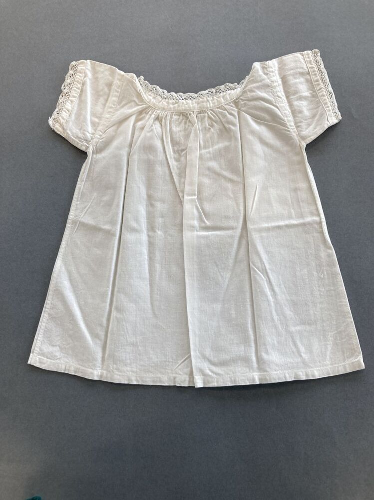 Gerend wit katoenen meisjeshemd met korte mouwtjes en halssplitje, hals en mouwen afgezet met kloskant,