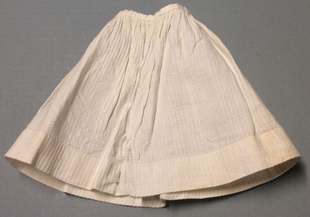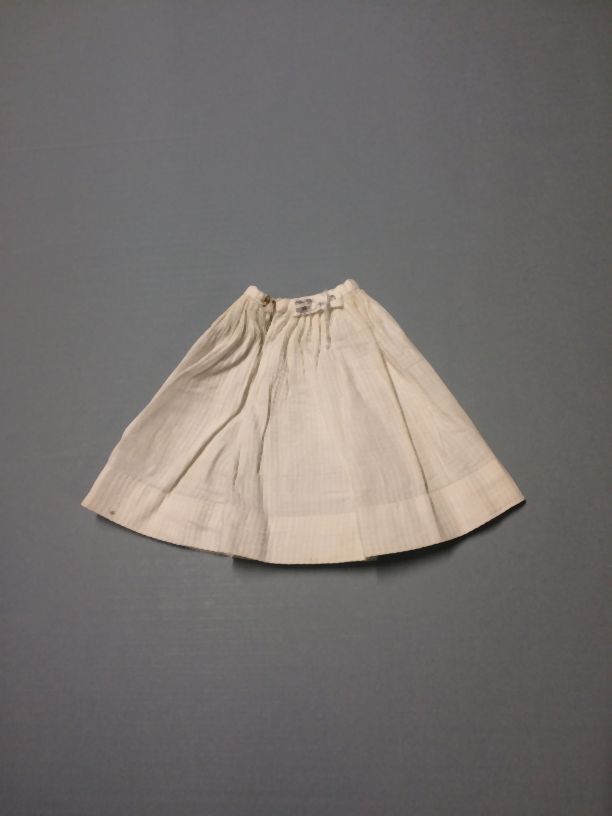 Poppenonderrok van wit katoen met verticale kabelstrepen en tailleband met haak en oog, onderdeel van groep van twee