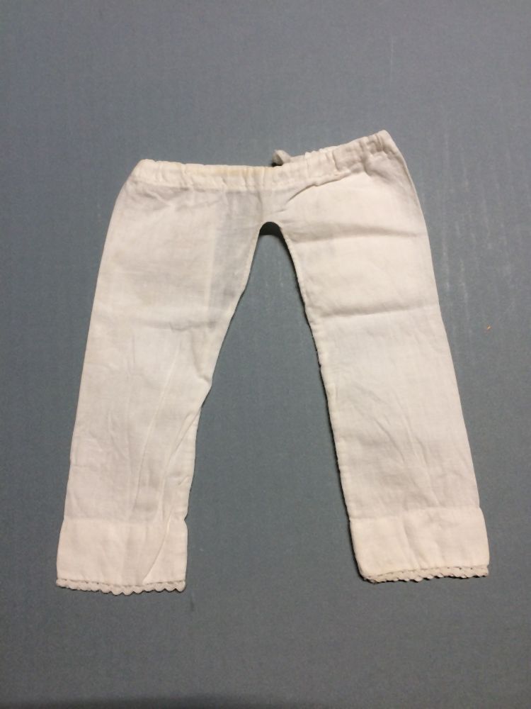 Poppenonderbroek van wit katoen met open kruis, zigzagband langs de pijp, onderdeel van groep van zes