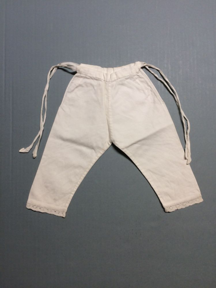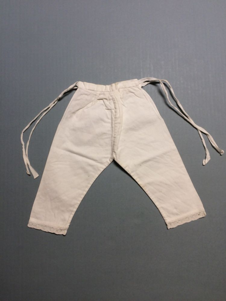 Poppenonderbroek met klepsluiting, gevlochten kant langs pijpen, onderdeel van groep van zes