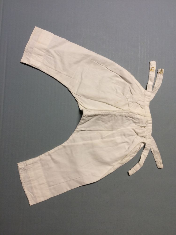 Poppenonderbroek met klepsluiting, dubbele tailleband en broderie langs de pijpen, onderdeel van groep van zes