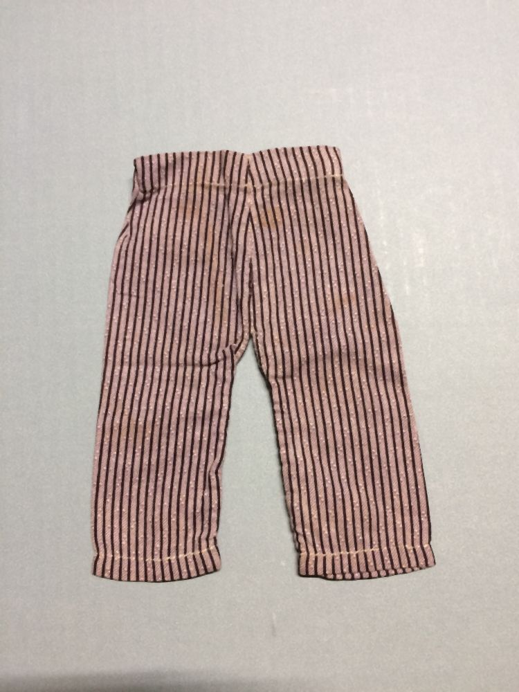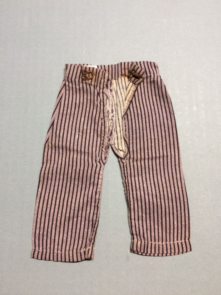 Poppenonderbroek van paars gestreept katoen met langs een split een ijzeren haak en oog, onderdeel van groep van zes