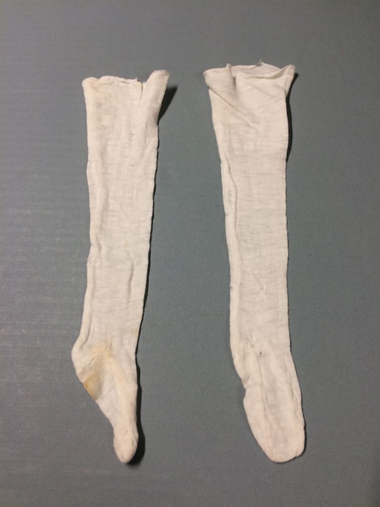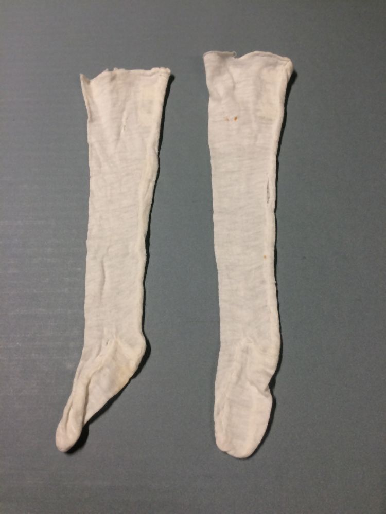 Paar lange kousen van dun wit tricot genaaid voor de pop, onderdeel van groep van twee paar