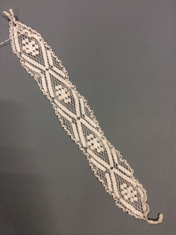 Gordijnhouder van grof filetknoopwerk met wit vissersgaren, doorgestopt met dit katoenen garen, vier geschakelde ruiten, onderdeel van groep van acht