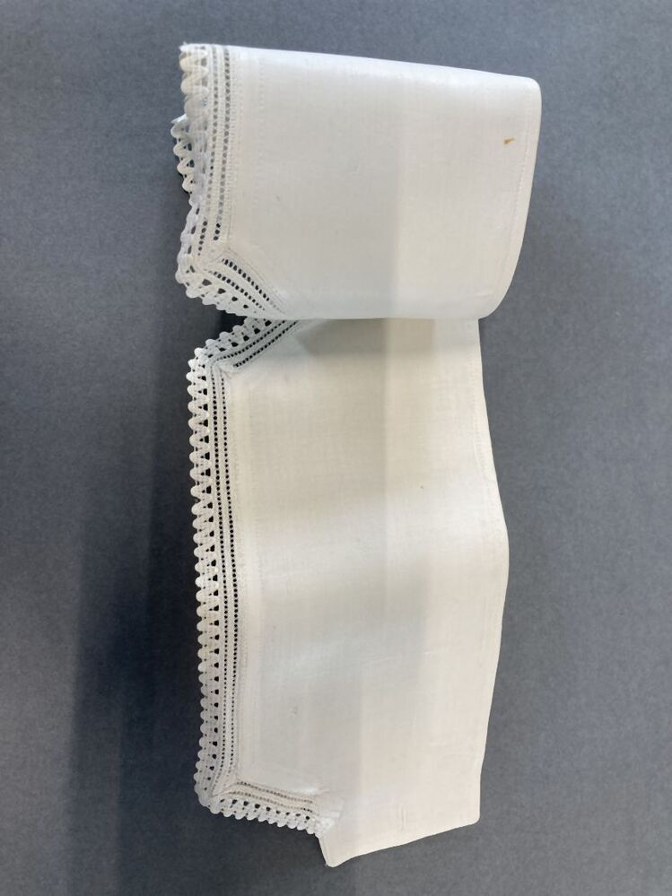 Paar gesteven manchetten van fijn wit katoen afgezet met 'gebreid' machinaal kant
