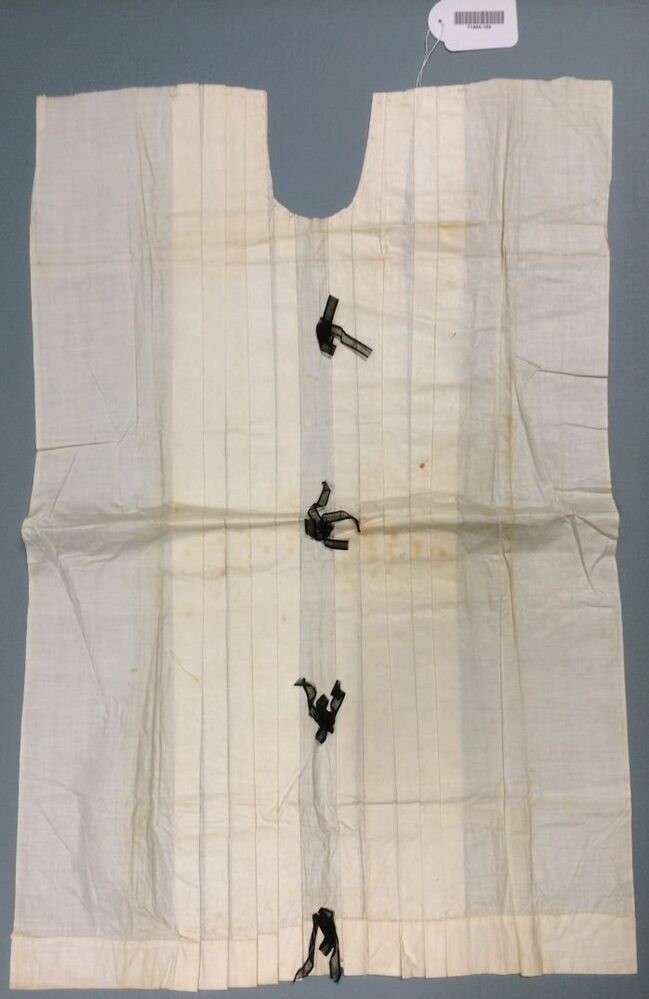 Front (hemd?) van wit katoen met verticale plooien, mv. versierd met zwarte strikjes
