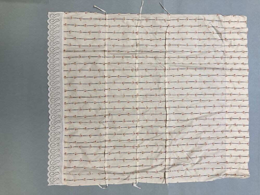 Pakdoek van crèmekleurig katoen en bedrukt met blauwe strepen en roze rozeknopjes
